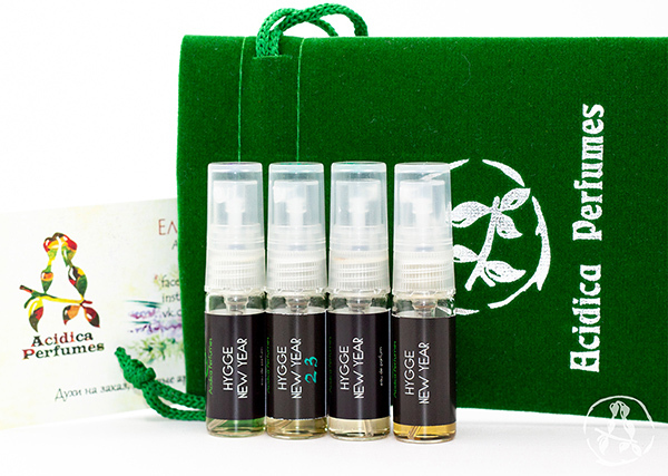 В 2018 году я создала аромат Hygge New Year для конкурса новогодних духов. Через несколько лет я решила продолжить линейку новогодних ароматов, и так возникла традиция создавать новогоднюю лимитку к декабрьским выставкам авторской парфюмерии и радовать фанов Acidica Perfumes ароматными предсказаниями на год грядущий. В коллекции