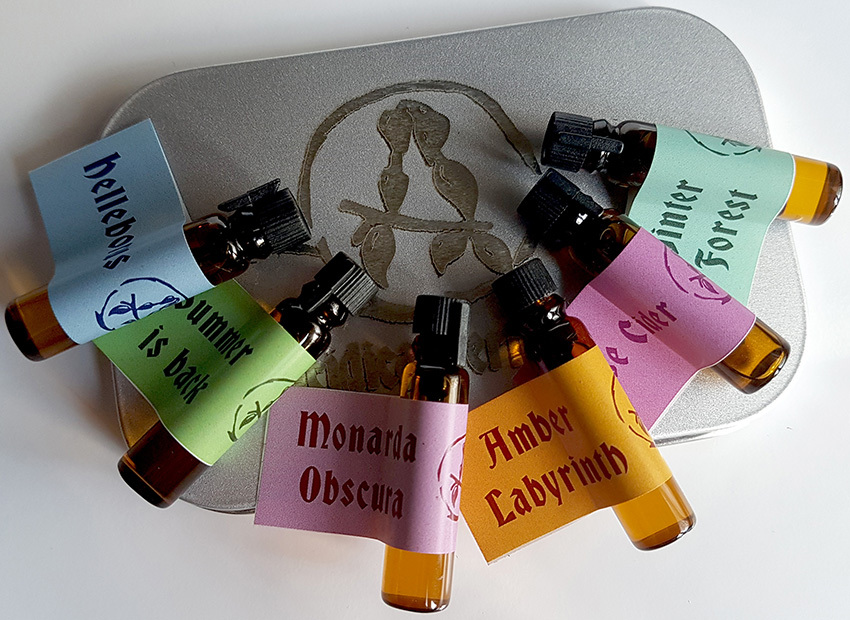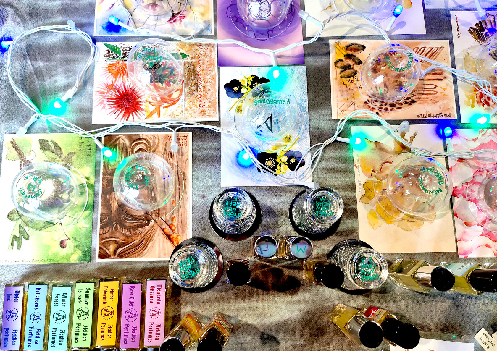 Елена Пильгун и Анна Закревская, плодами нашего творческого союза стали замечательные акварельные открытки, вдохновленные моими духами, и этикетки к ним, несколько совместных выставок и презентаций. Время идет, мы меняемся, и в один прекрасный день каждый из нас пошел своим путем. Поэтому с 2019 года всю полиграфию и дизайн я создаю самостоятельно.